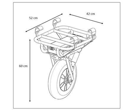 Scope of delivery: Electric wheel, YAKwheel-P1 frame, 1x battery pack, remote control, battery charger, remote control charger, quick attachment straps.